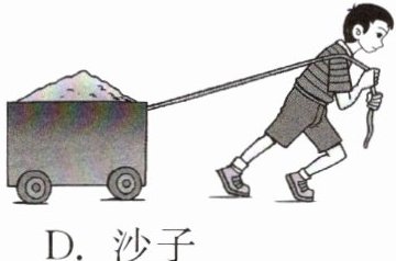 11. 如图所示,小车内装满沙子,小明用绳拉小车将沙子运到前方,此时小明受到斜向后下方的作用力,这个力的施力物体是 ()