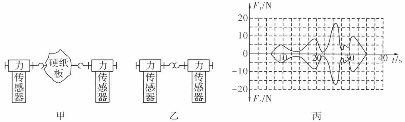 15. 某科学兴趣小组同学研究两个物体间相互作用力$F_1$和$F_2$的特点。现有器材:力传感器(相当于测力计)、数据采集器(可将力传感器测得的数据采集后输送至计算机)、计算机、硬纸板、细绳等。图甲、乙为他们设计的两种实验方案。