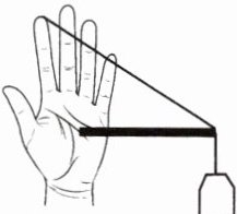11. 小红在建筑工地上看到简易吊车,她想通过实验来了解简易吊车直立在地面上时支撑直杆所受的力。回家后,她找来一根细绳和一把塑料直尺,仿照简易吊车的结构组成如图所示的三角支架,将细绳的一端绕在手指上,另一端挂一重物,塑料直尺的一端顶在掌心时,细绳对手指以及塑料直尺对掌心均有作用力。下列对这两个作用力的方向判断正确的是 ()