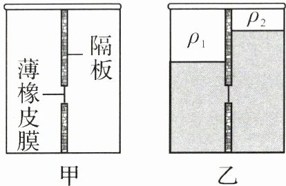 (2)向装置两侧分别加入密度为$\rho_1$、$\rho_2$的两种液体,液面如图乙所示(薄橡皮膜凹凸情况未画出)。