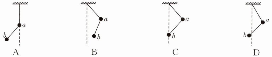 14. 用两根轻质细线把两个完全相同的小球悬挂起来,如图所示。现对小球 b 施加一个水平向左的恒力,同时对小球 a 施加一个水平向右的恒力,两个力大小相等。平衡时两球的位置可能是下图中的 ()