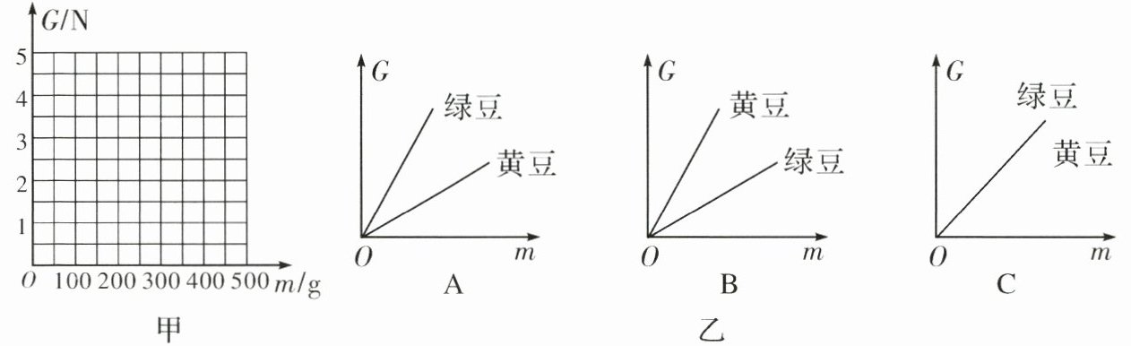 23. 在探究物体重力的大小跟质量的关系实验中,楚老师给不同小组提供了相同规格及标度相同的透明坐标纸(如图甲所示),并随机提供绿豆、红豆或黄豆一包(每组只有一种豆)。各小组利用弹簧测力计和天平测得多组豆的重力与质量的实验数据。