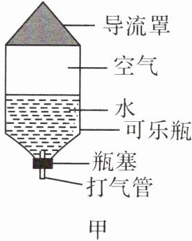 12. 在即将进行的中学公益科技节上,某项目化实验小组利用可乐瓶等材料制作“水火箭”,并进行飞行高度测试实验。“水火箭”的结构如图甲所示。实验过程如下:将“水火箭”竖立于地面上,用打气筒通过打气管向瓶内打气,当瓶内压强足够大时,瓶塞脱落,瓶内的水向下喷出,“水火箭”竖直向上飞行。