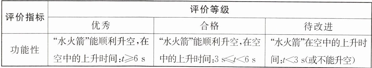 (3)优秀;水火箭在空中的上升时间为8s,满足优秀等级中上升时间$t\geq6\, s$的评价指标。