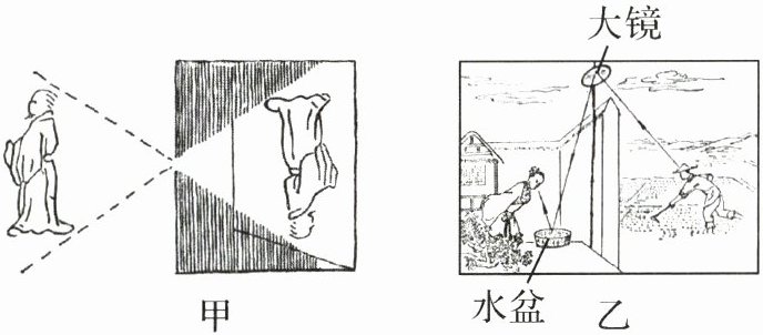 (2) 刘安在《淮南万毕术》中谈道:“取大镜高悬,置水盆于其下,则见四邻矣。”如图乙是简易的(填“显微镜”“潜望镜”或“望远镜”)的雏形。