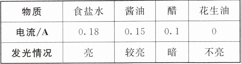 6. 小科找来了四种物质,利用如图所示的电路在相同条件下检测其导电性能(将待测物质分别接入电路$A$、$B$间)。实验观测到的电流表示数和灯泡发光情况记录如下表所示,则下列物质导电能力最强的是 (