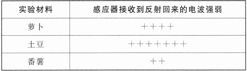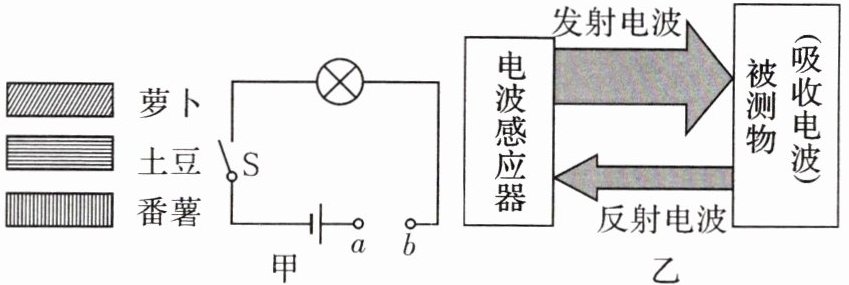 (3)在实际操作过程中,小科发现实验现象不明显,无法达到实验目的。他通过查阅资料发现,有一种电波感应器(如图乙所示),能向物体发射电波,并根据物体反射回来的电波强弱来判断物体的导电能力,物体反射回来的电波越弱,则该物体的导电能力越强。若向萝卜、土豆、番薯发射相同强度的电波,反射回来的电波结果如表所示(“+”号越多表示电波越强),则萝卜、土豆、番薯中导电能力最强的是。