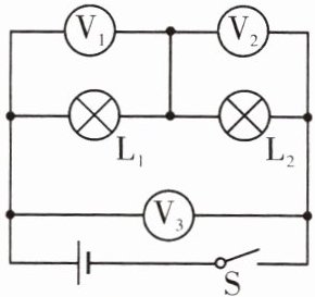 3. 如图所示,在探究串联电路电压的关系时,闭合开关 S 后,电压表 V₁ 的示数是 2.5 V,电压表 V₂ 的示数是 3.8 V,则电压表 V₃ 的示数是 (