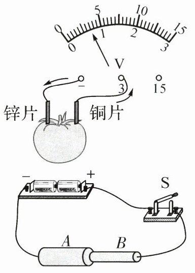 7. 在番茄上相隔一定距离分别插入铜片和锌片,即制成番茄电池。将铜片、锌片与电压表用导线相连,如图所示。下列说法正确的是 ()