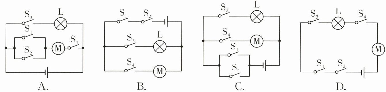 5. 小明为自家的花卉大棚设计了一个智能电路管理系统。整个电路的通断可以通过手动控制开关$S_1$或手机远程控制开关$S_2$实现。当花卉大棚内光线较暗时,光控开关$S_3$自动闭合,接通灯泡;当需要给花卉大棚通风时,闭合开关$S_4$,启动风机。灯泡和风机均可独立工作,该系统的简化电路图符合要求的是 ()