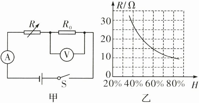 23. 小科设计了如图甲所示的电路图,将湿敏电阻$R$固定在植物叶片上,来检测植物叶片含水量的变化(图中植物叶片未画出)。已知湿敏电阻$R$的阻值随植物叶片含水量$H$的变化关系如图乙所示,电源电压恒为6V,定值电阻$R_0$的阻值为$30\Omega$。