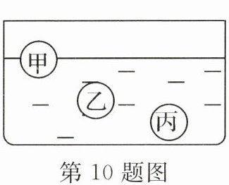 10. 三个体积相同、质量不同的球放在水槽中,如图所示,其中受到浮力最小的是 ()