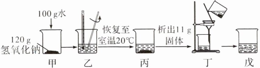 B.丁中过滤后得到的是$20\ ^{\circ} C$时氢氧化钠的饱和溶液