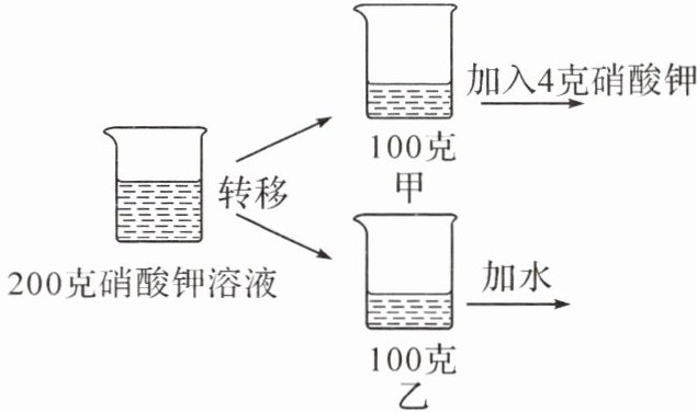 (1)转移后甲杯中含溶质硝酸钾$20$克,加入$4$克硝酸钾后溶质质量分数约$23.1\%$;