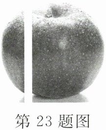23. 小李将一个苹果放入水中,苹果在水里处于悬浮状态,则此苹果的密度为$kg/m^3$。小李从水中取出苹果,切成一大块和一小块(如图所示),再将小块苹果放入水中,发现小块苹果沉入水中,据此现象可以推断:若将大块苹果浸没于水中,松手后大块苹果将会(填“上浮”“悬浮”或“下沉”)。