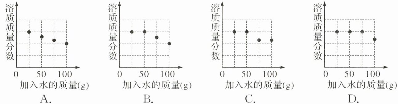 24. 为了探究溶液的溶质质量分数与加入水的的质量的关系,小明在配制硝酸钾溶液的过程中(室温$20^{\circ}C$),向硝酸钾中分批加水,充分搅拌,流程如下: