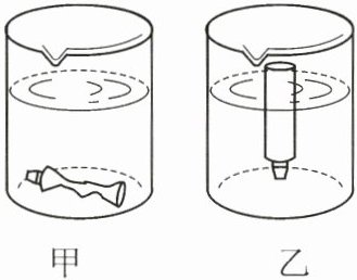B.图甲中牙膏壳完全浸没于水中,图乙中牙膏壳只有部分浸入水中,因此两次实验牙膏壳排开水的体积$V_{甲}>V_{乙}$