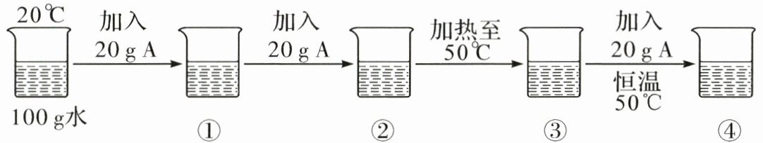 23. 已知A物质在$20^{\circ}C$时溶解度为30克,$50^{\circ}C$时溶解度为110克。小金同学利用A物质进行了如图实验。