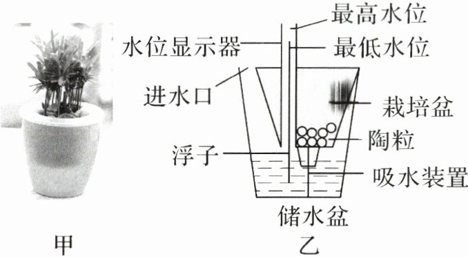 25. 小宁的妈妈新买了一株种在懒人花盆中的植物,如图甲所示。好奇的小宁观察后发现,懒人花盆的最外面是一个储水盆,里面有一个栽培盆,栽培盆中有一圆柱体浮子能在光滑的管中自由上下浮动,浮子的顶端可显示水位高低。栽培盆底的陶粒起到吸水和透气的作用。懒人花盆的原理图可简化成图乙。