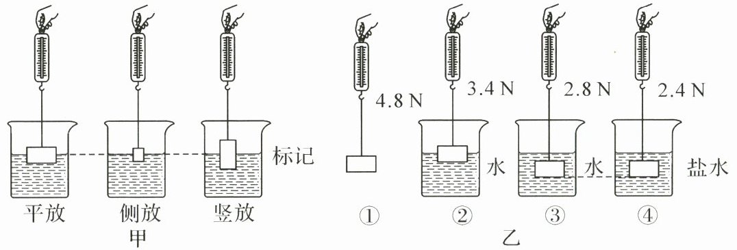 (3)图乙①(空气中)、③(水中完全浸没)、④(盐水中完全浸没),排开液体体积相同,液体密度不同,浮力不同,验证浮力与液体密度有关。