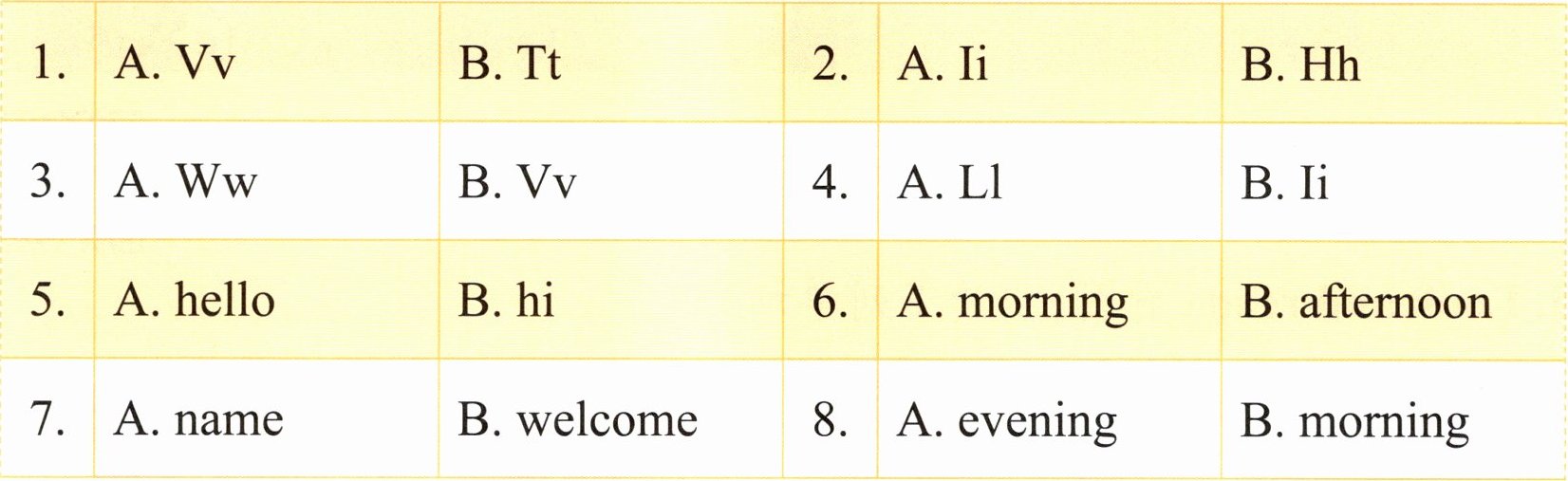 1. Vv (A) 2. Hh (B) 3. Ww (A) 4. Ll (A) 5. hi (B) 6. morning (A) 7. name (A) 8. evening (A)