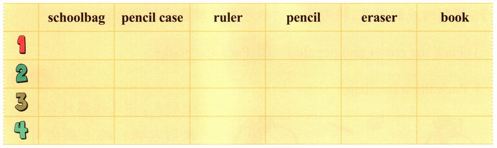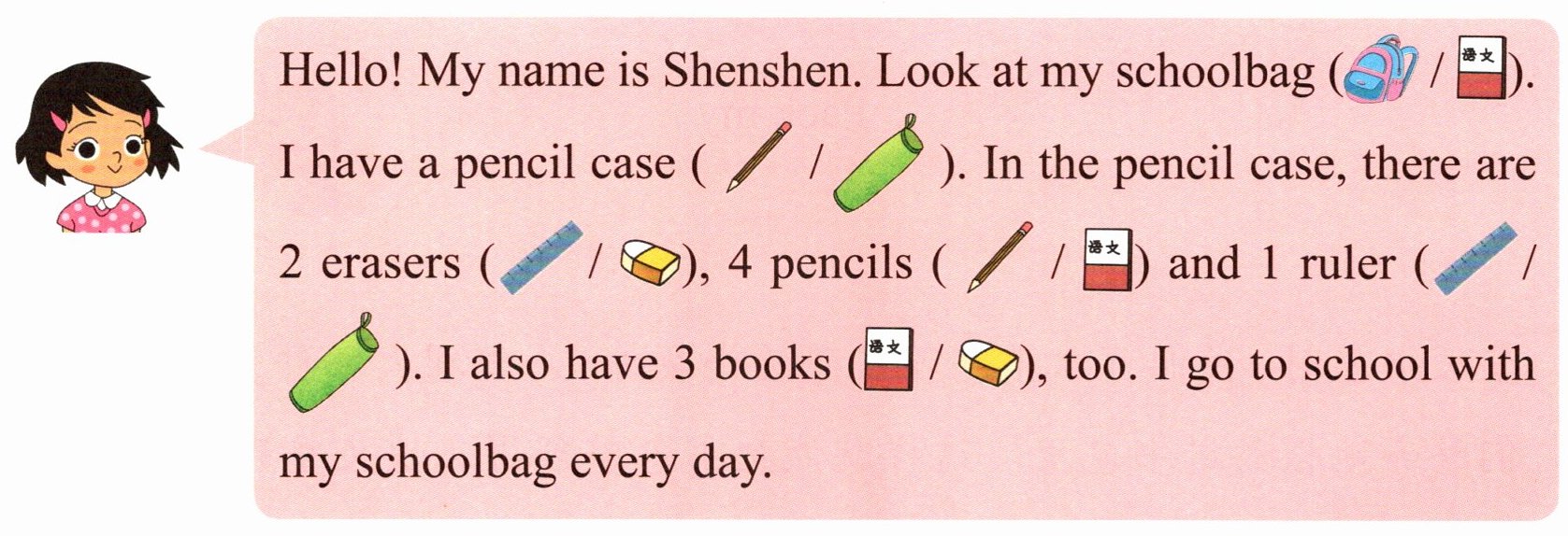 V. Read, circle and tick(Shenshen的书包里有些什么呢?读一读她的介绍,圈出相应的图片并在表格里勾出文具的数量)