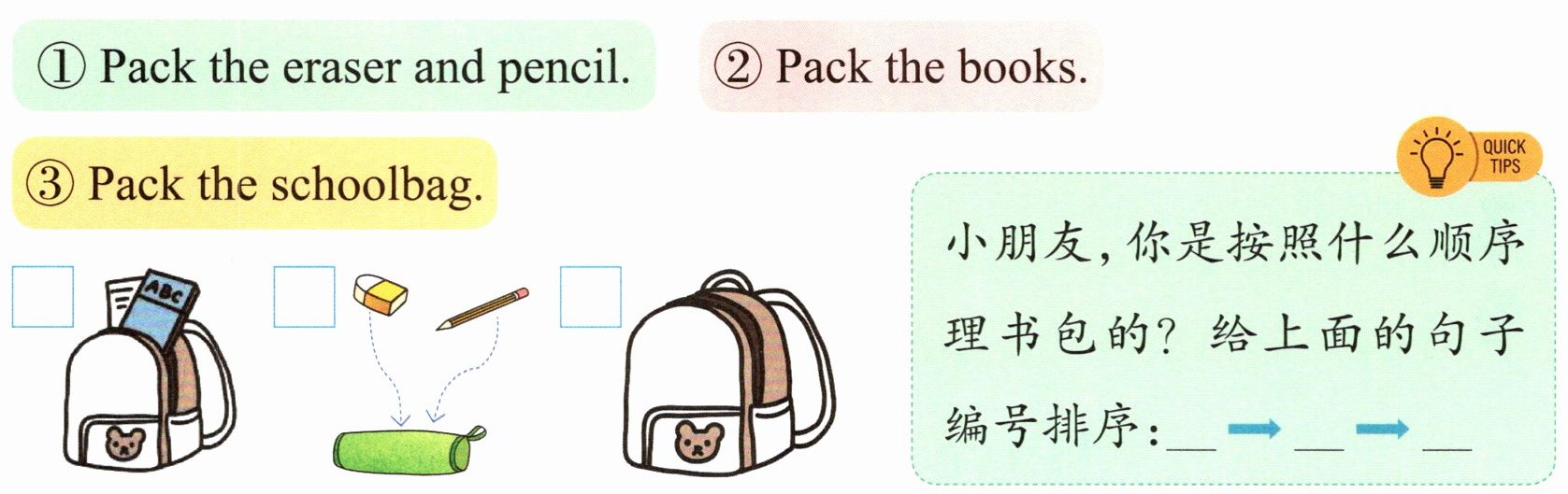5. Xiaojiang的书包很乱,妈妈对她说:“Pack my schoolbag.”