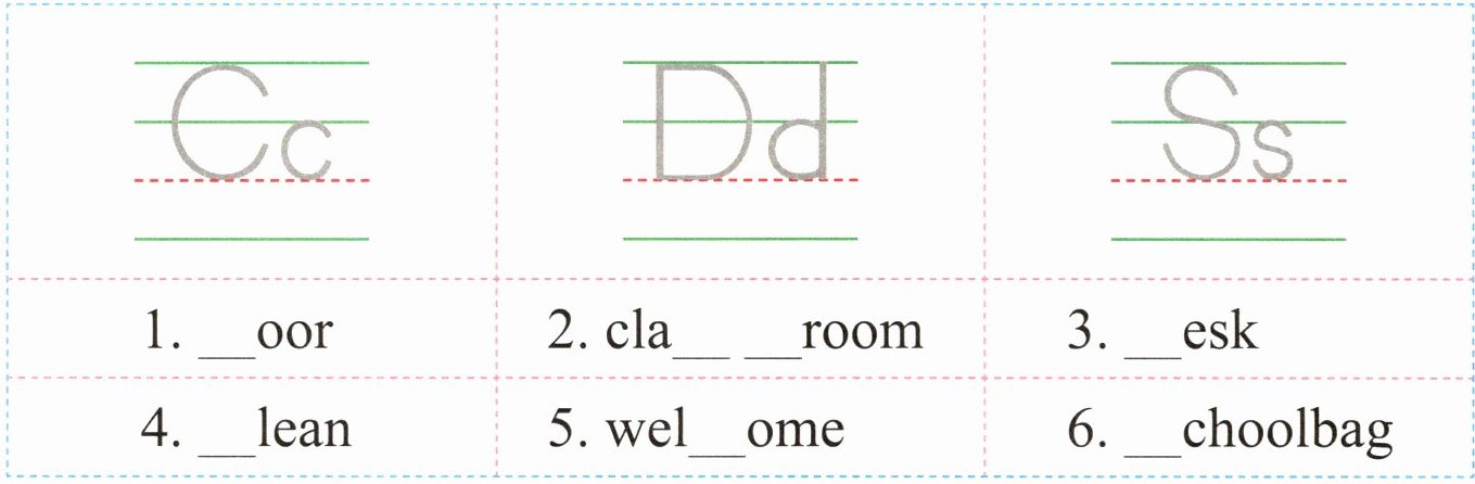 描写略 1. door 2. classroom 3. desk 4. clean 5. welcome 6. schoolbag