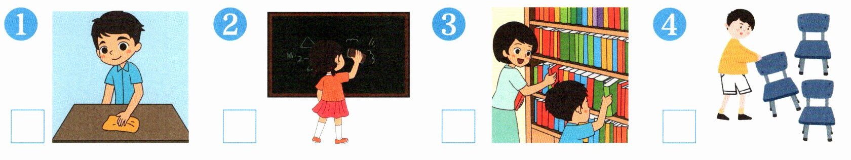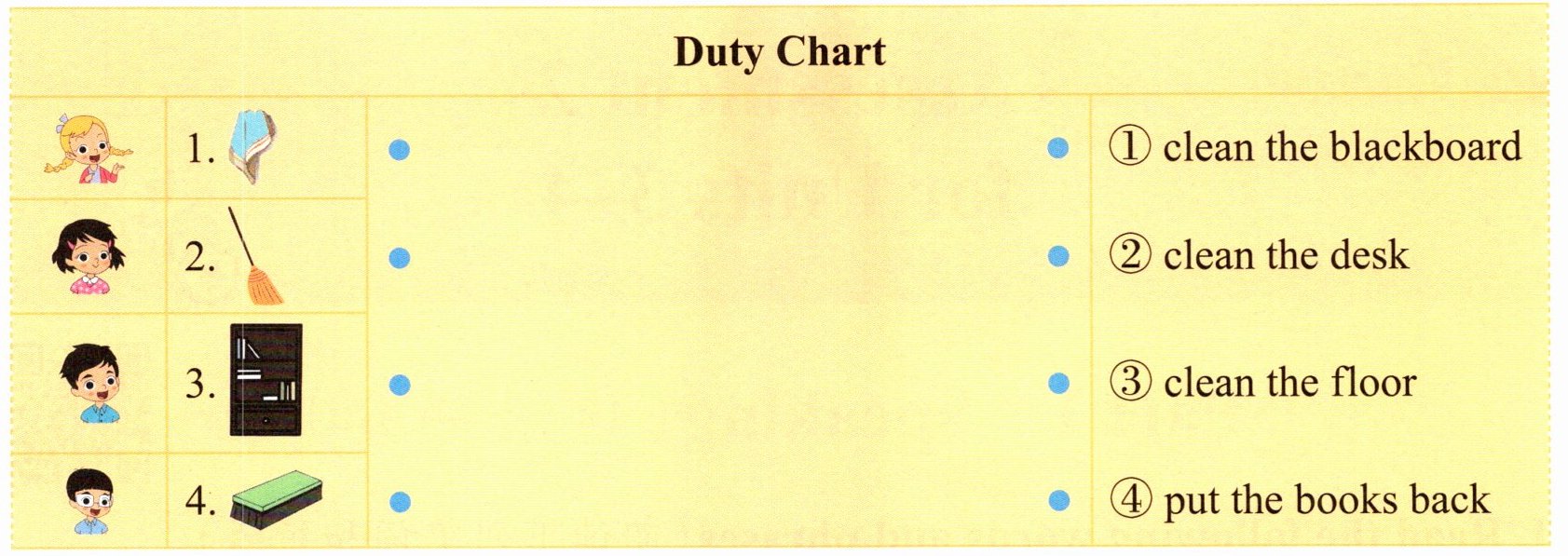 Ⅴ. Look, match and write(放学后,同学们正在打扫教室。下面是今天的值日表。请你仔细观察同学们使用的工具,将图片与任务配对。然后读一读对话,选择正确的句子补全对话,将数字编号填在横线上)