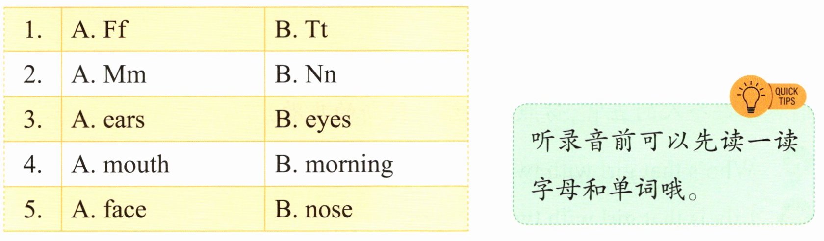 Ⅱ. Listen and circle(耳朵能够帮助我们听到各种声音。用你的耳朵仔细听一听,圈出你听到的字母或单词)