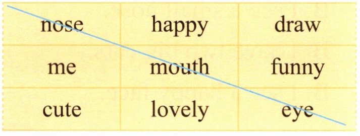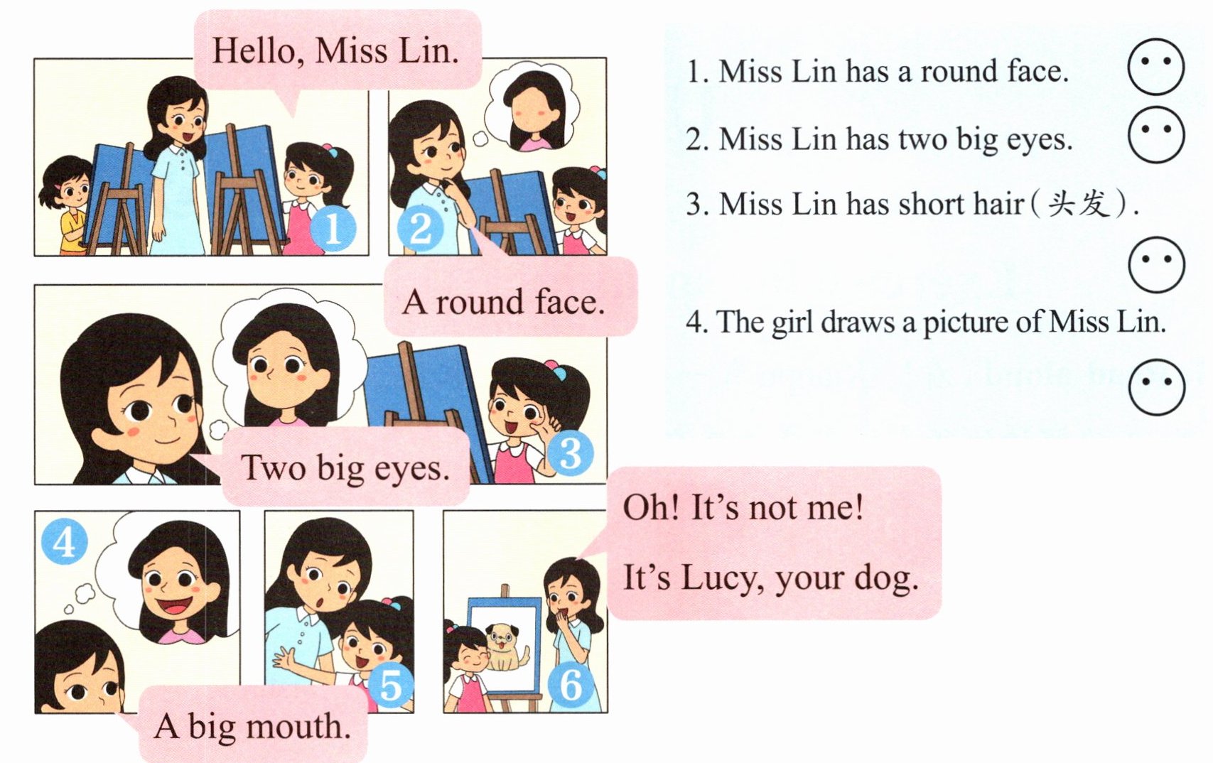 1.☺ 2.☺ 3.☹ 4.☹ 重点详解 1. 观察图片可知,Miss Lin的脸是圆的,所以此题正确。4. 故事中,Miss Lin说:"It's not me! It's Lucy, your dog." 说明小女孩画的不是Miss Lin而是她的小狗,Lucy,所以此题错误。