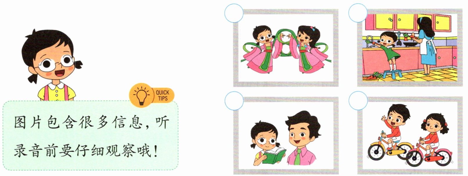 Ⅰ. Listen and number(Xinxin喜欢把和家人朋友在一起的时光记录下来。请根据听到的内容,用1—4给下列照片排列)