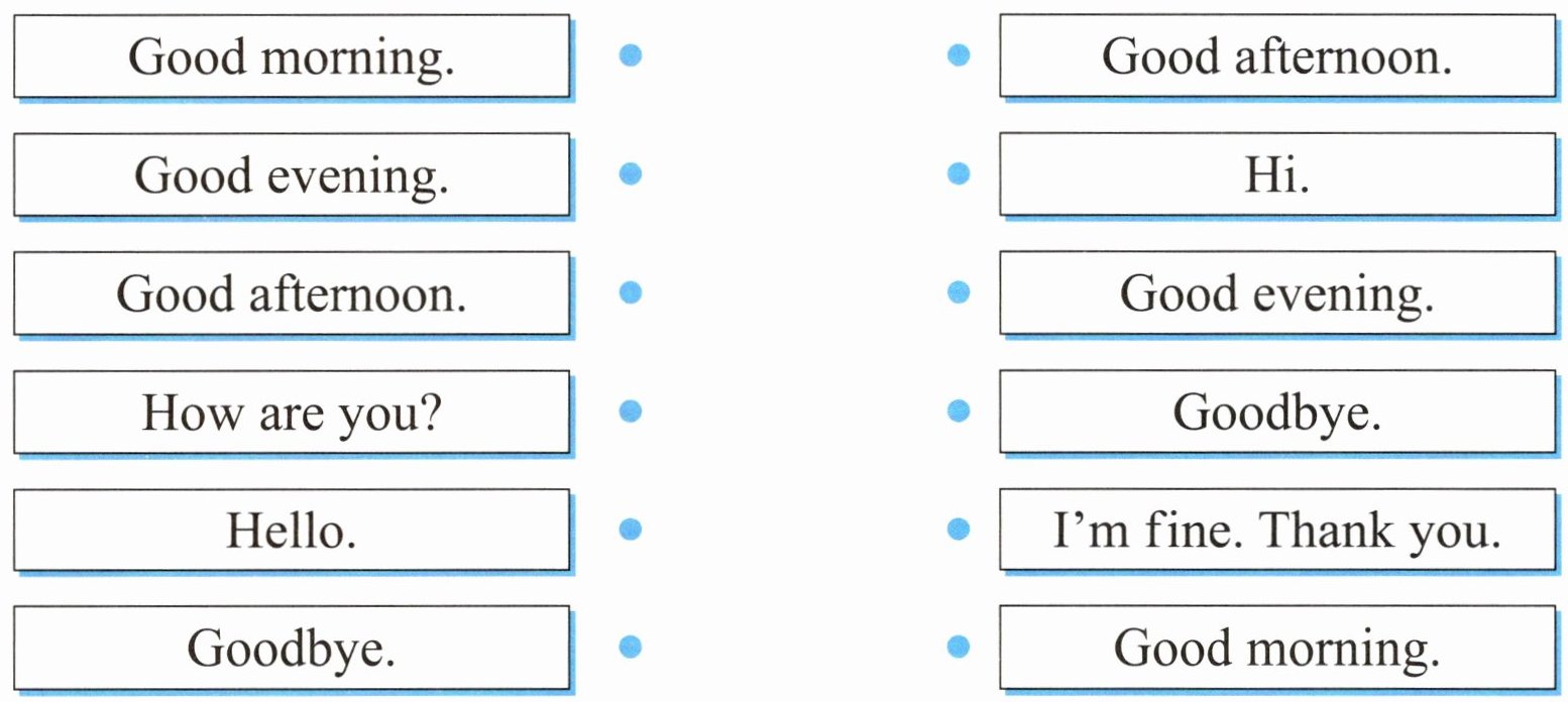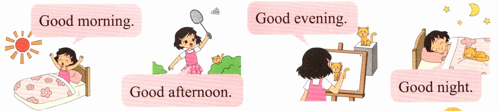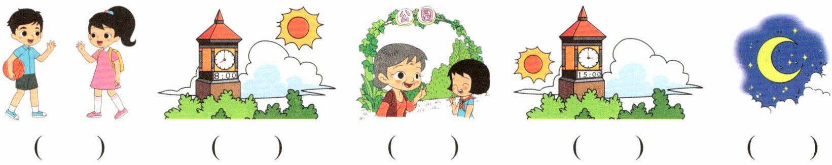 ① morning ② afternoon ③ evening ④ hello ⑤ goodbye