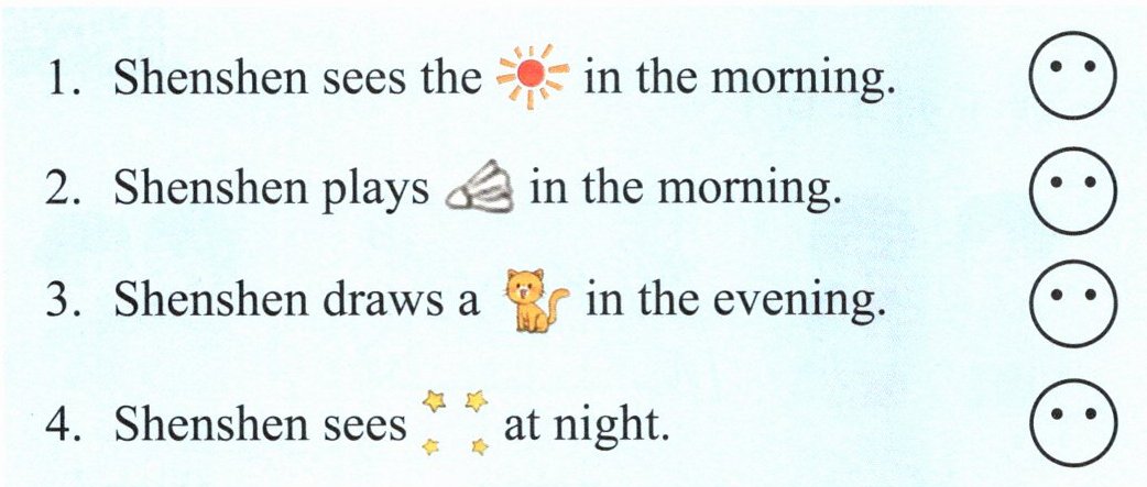 Ⅳ. Read, judge and draw(美好的一天从早晨开始,Shenshen这一天做了什么呢?读一读下面的故事并判断,与故事内容相符的画