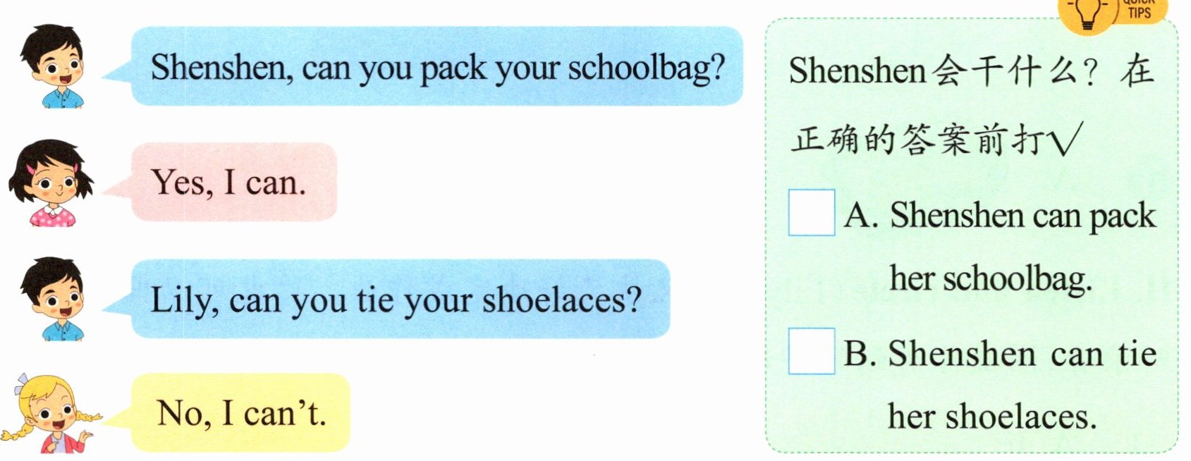 Ⅱ. Read and act(Xiaopu 正在教室里做小调查,询问同学们会干什么?请你读一读他们的对话)