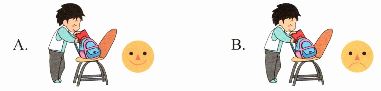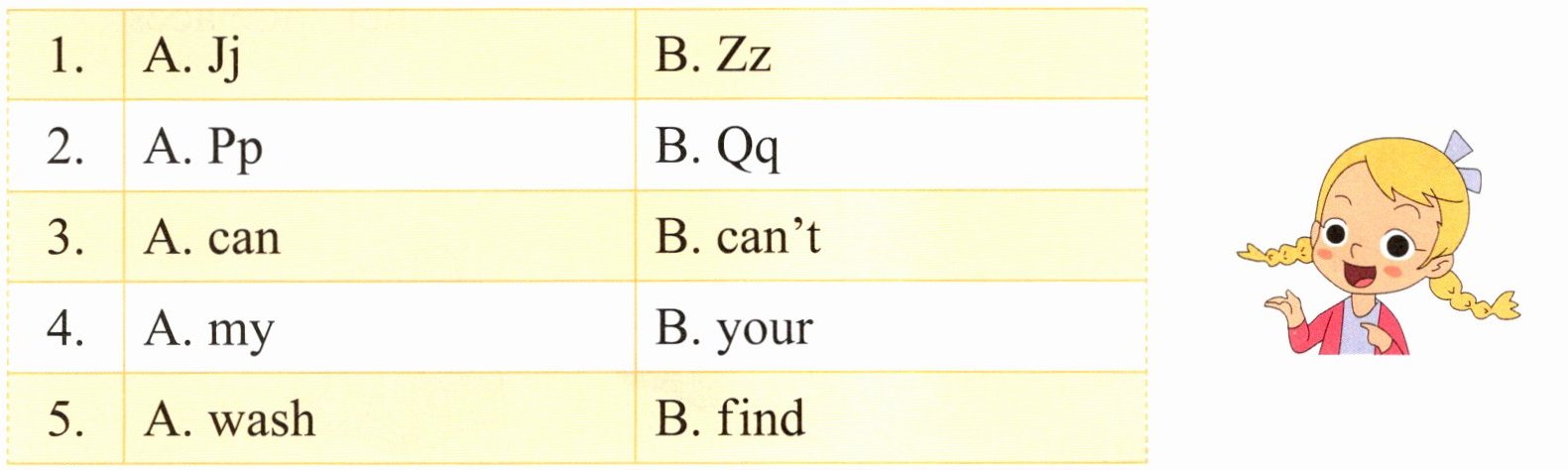 1. Jj (A) 2. Qq (B) 3. I can do it. (A) 4. Can you tie your shoelaces? (B) 5. I can't find the book. Where is it? (B)
