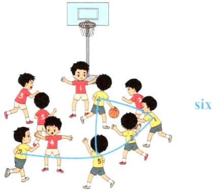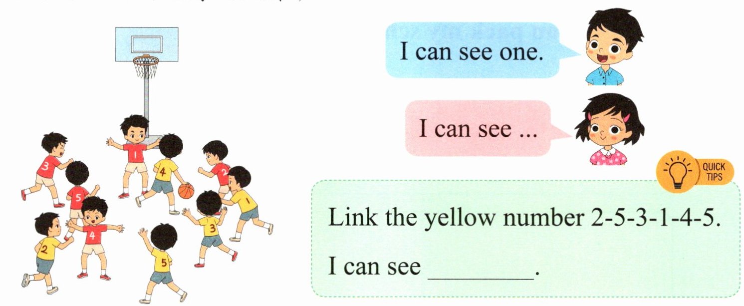 Ⅱ. Look, say and link(两队小朋友正在打篮球,他们是几号队员?你找到数字了吗?请你用手指点一点,说一说。最后把穿黄色衣服的小朋友按2 - 5 - 3 - 1 - 4 - 5的顺序连起来)