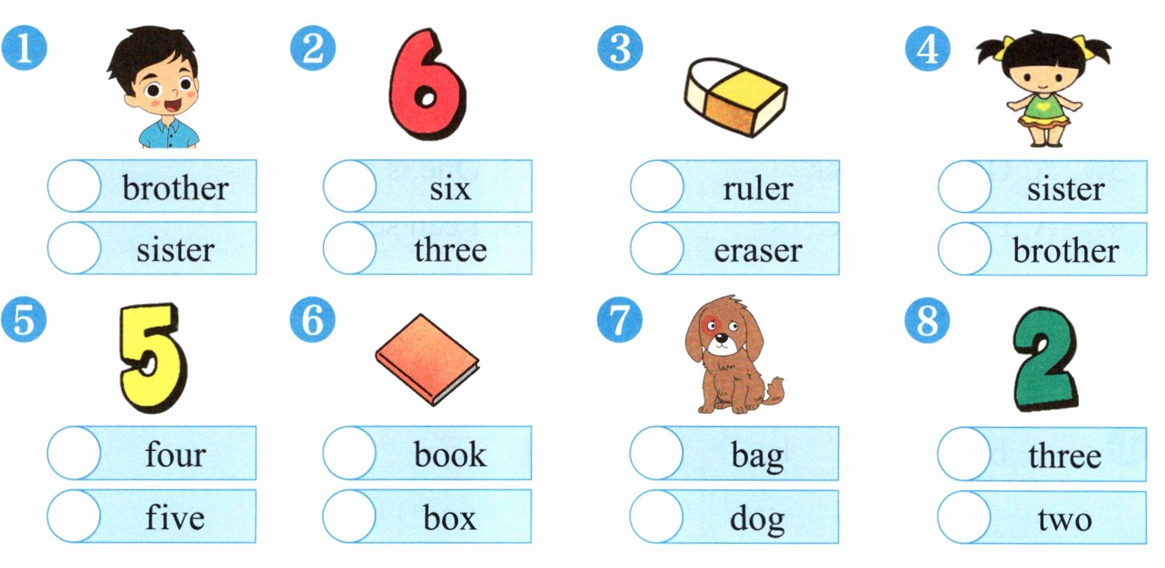 1. brother 2. six 3. eraser 4. sister 5. five 6. book 7. dog 8. two