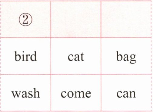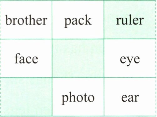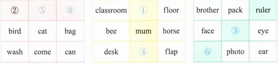 Ⅲ. Think and complete(同学们在玩井字游戏。请你用上一题中的单词进行游戏,给涂色的这一列找出相应的同类词,在空格处填写数字编号)