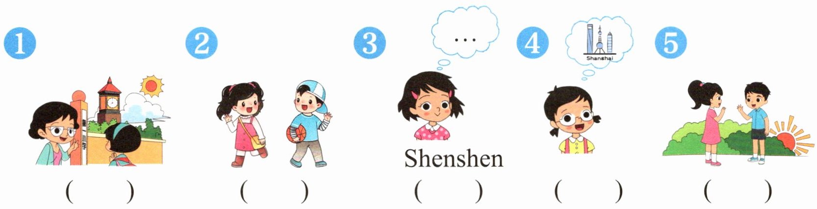Ⅰ. Listen and number(下列图片中的小朋友是如何与同学和家人打招呼的呢?听一听录音,根据顺序给图片编号)