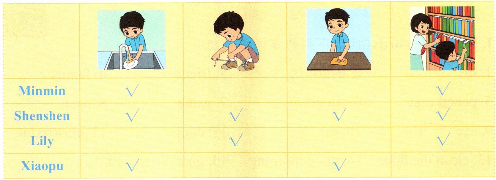 Look, choose and write(根据同学们做家务情况的调查结果,选择正确的内容完成报告,将字母编号写在横线上)