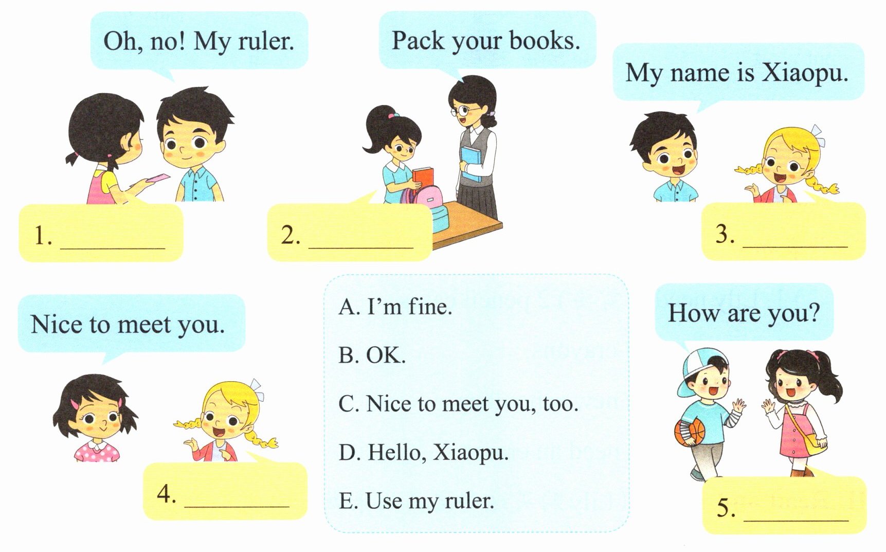 (下面图片中的人物正在交谈。他们如何对话?请读一读,选出正确的句子,把字母代号填在横线上)