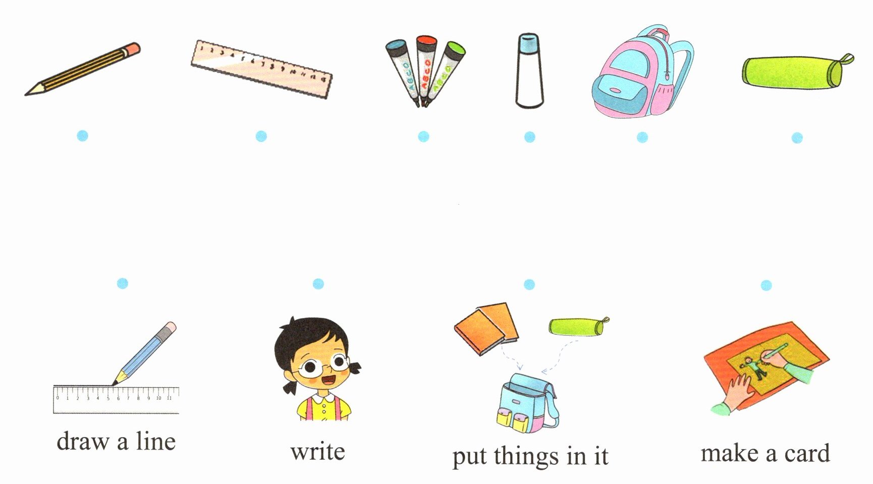 (Lily购买这些文具用来做什么呢?请将文具与它们的用途连线)