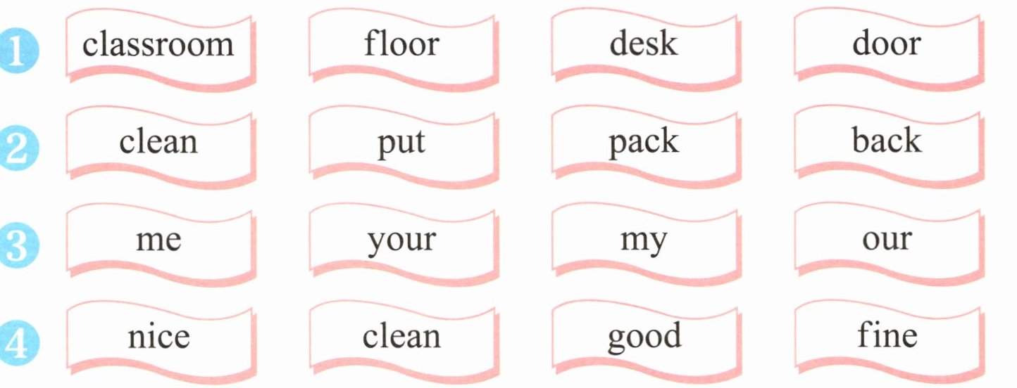 1. classroom 2. back 3. me 4. clean 要点讲解 3. 此题主要考查物主代词和人称代词的辨析。my, our, your都是物主代词,表示“……的”。me是人称代词,表示“我”,因此本题中的me是不同类的。