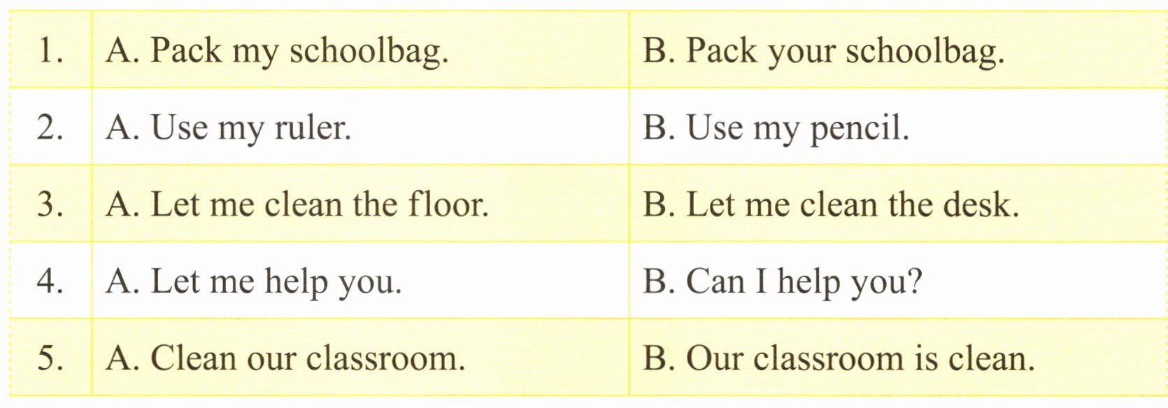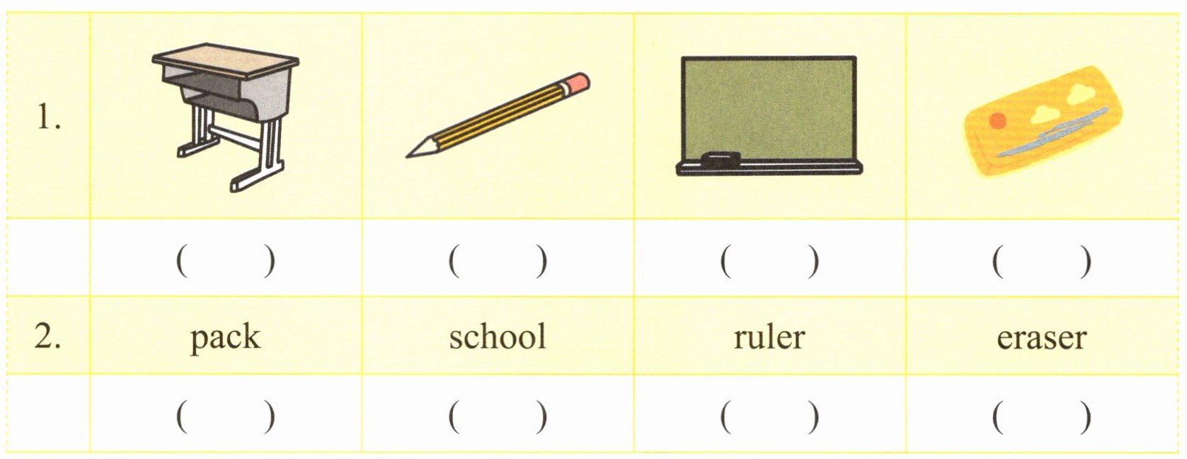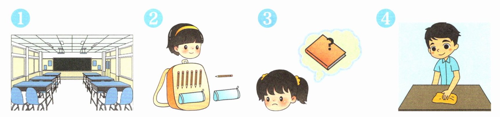 1. Look at our classroom. I see a pencil in the pencil case. The pencil case is on the desk. The blackboard is dirty (脏的) . Let me clean it. (3 1 4 2) 2. Tomorrow is my first day to school. Let me pack the ruler. Let me pack the eraser. OK. I'm ready. (2 1 3 4)