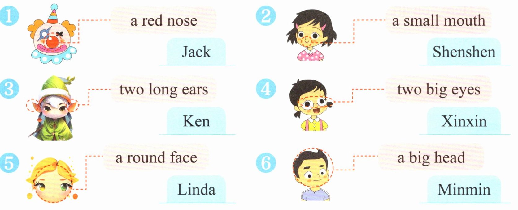Ⅰ. Read aloud(每个人的五官各有特点。请观察图片并大声朗读下列短语,看看你能通过五官记住这些人物吗?)