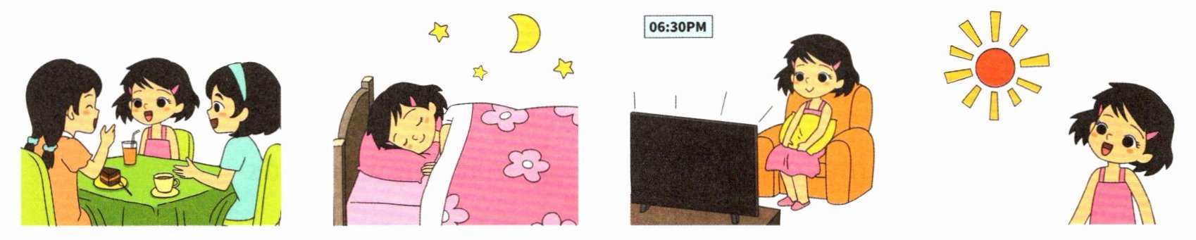 Hello, I'm Tracy. I am a girl. It is morning. I can see the sun. It is red. It is afternoon. I have afternoon tea with my friends. Yummy! It is evening. I watch TV. It is night. I go to bed. What a nice day!