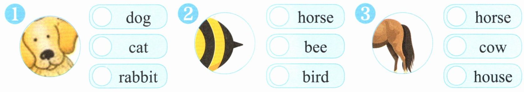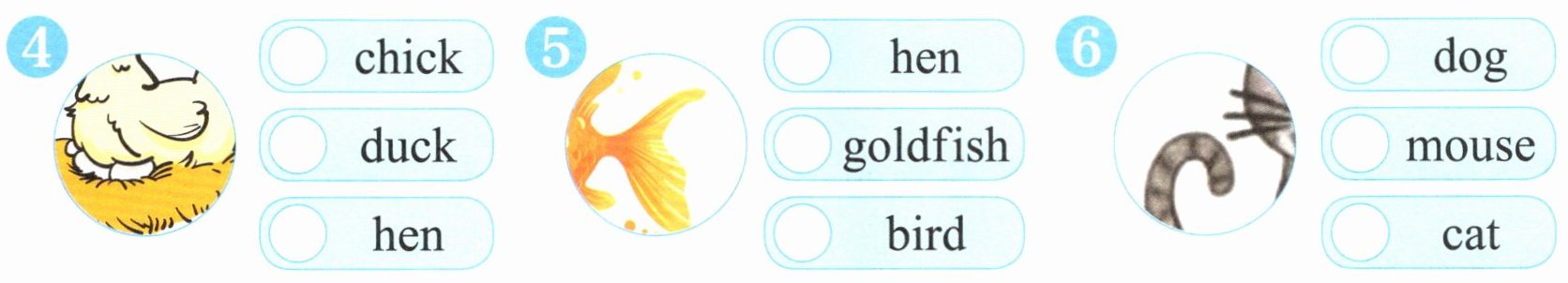 1. dog 2. bee 3. horse 4. hen 5. goldfish 6. cat
