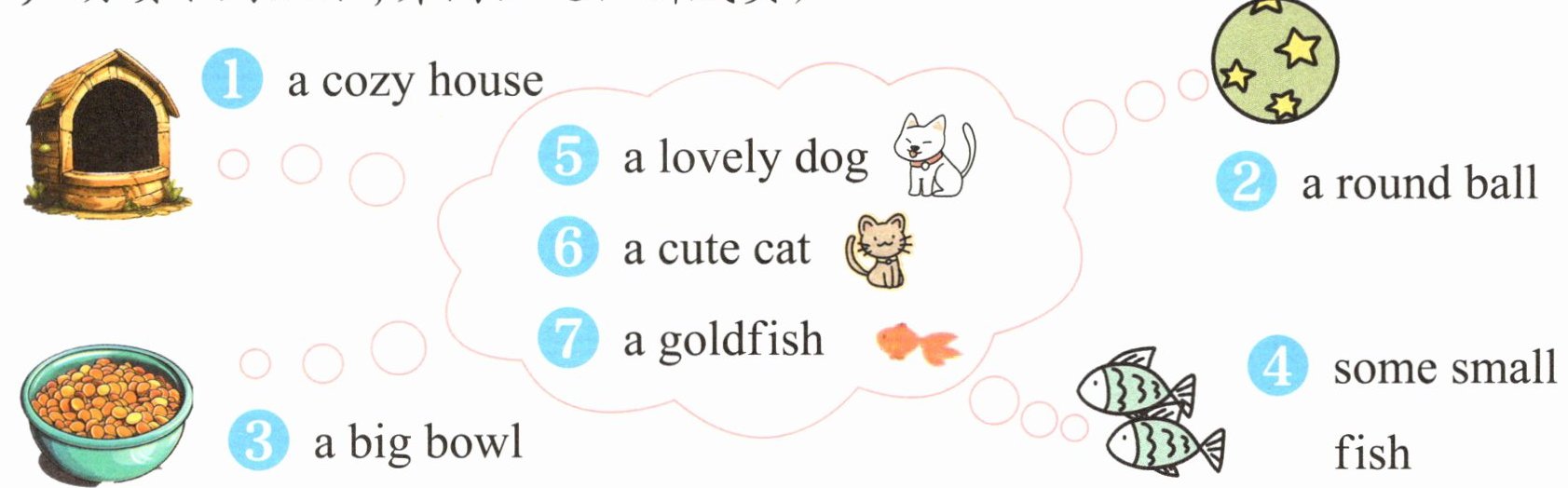 Ⅰ. Read aloud and circle (Lily 家来了一位新成员 Ginger, 请观察图片并大声朗读下列短语, 并圈出这位新成员)