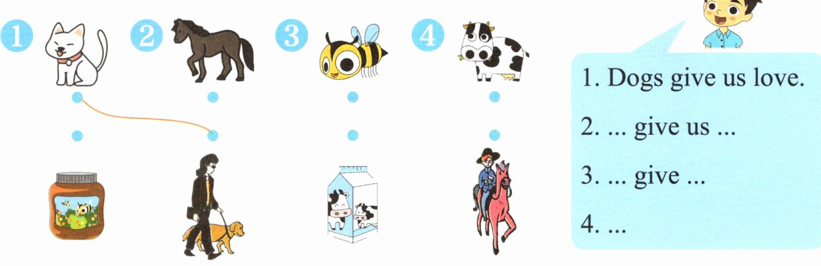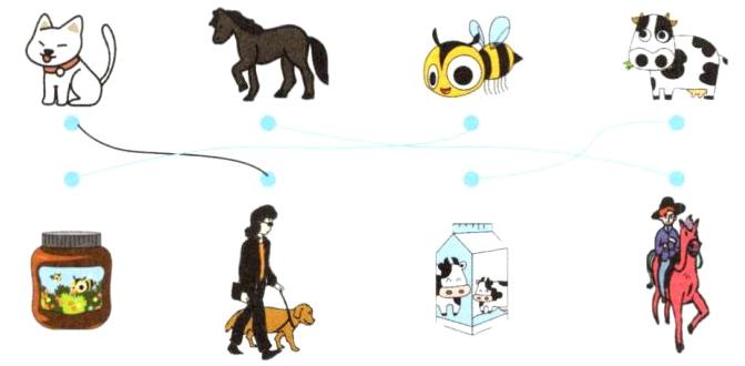Ⅱ. Match and say (小动物给我们很多帮助, 请你观察图片完成连线, 并照样子说一说)